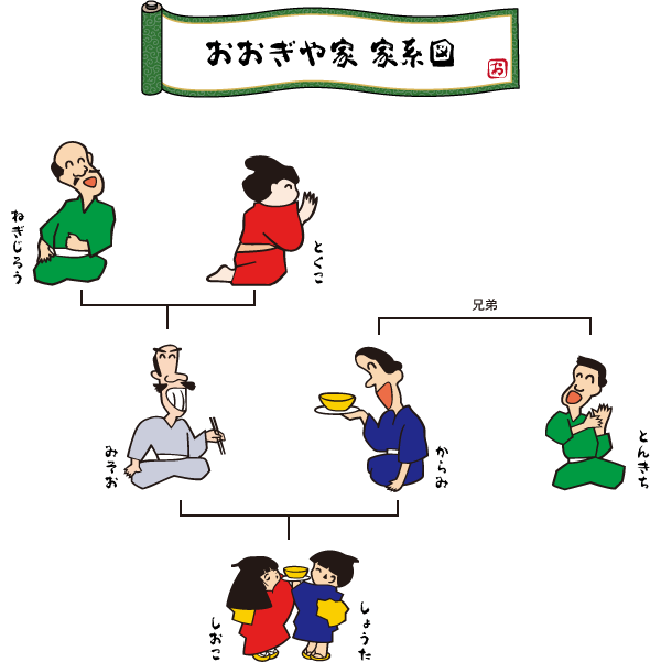ホームおおぎや家の人々OOGIYA FAMILYおおぎや家の人々ぐんまのどこかに住んでいる、おおぎや家の人々。だいすきなラーメンをたべて、いつでも笑顔いっぱい。今日はどこのおおぎやで会えるかな。ねぎじろう(とくこの夫・みそおの父)好きなラーメン:ねぎみそとくこ(ねぎじろうの妻・みそおの母)好きなラーメン:マル得みそみそお(からみの夫)好きなラーメン:みそからみ(みそおの妻)好きなラーメン:辛みそしおこ しょうた(みそお・からみの子どもたち)好きなラーメン:塩・正油とんきち(からみの弟)好きなラーメン:東京とんこつ家系図で見る